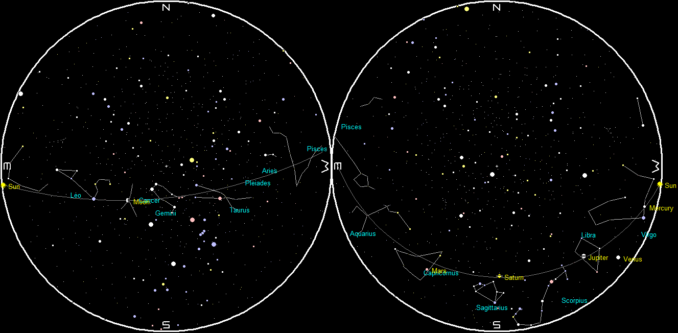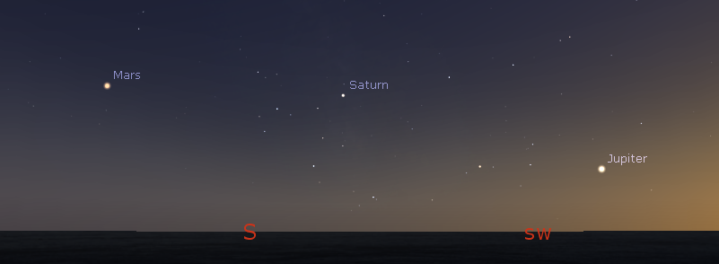 Let’s look at the bright planets today. Three of them are visible in the evening sky. The brilliant Venus will be just too low to spot, setting 29 minutes after the Sun. The problem isn’t its separation from the Sun, but it is also south of the Sun’s path. Jupiter will be in the southwest as it gets dark. The big planet will set at 9:03 p.m. Saturn will start the evening low in the south-southwest sky and will set at 11:31 p.m. I will be giving a talk about Saturn tonight at the Main branch of the library in Traverse City at 7 p.m. Mars will be low in the south-southeast as the skies darken tonight. and is now 56.7 million miles (91.3 million km) away. Mars will be due south at 9:34 p.m., and it will set at 2:03 a.m.