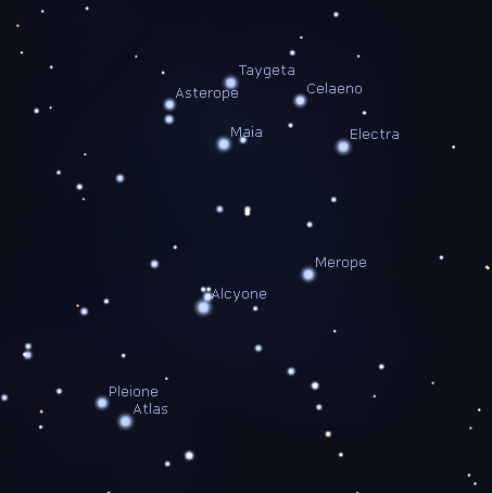 While I’ve mentioned the Pleiades with regard to its neighboring constellations several times this autumn I haven’t looked at this beautiful star cluster itself. The Pleiades appears as a group of six or seven stars visible to the naked eye, out of over a hundred stars, and is also known as the Seven Sisters. Some also mistake it for the Little Dipper, due to the little bowl shape in the center of the cluster. I call it the “tiny dipper”. The real Little Dipper is now hanging off Polaris in the north. There are a lot of stories about the Pleiades from many different cultures. From the Greek and Roman cultures we get our best known stories of them, that the seven sisters were the daughters of the god Atlas and Pleione. The 9 brightest stars bear the names of the sisters and their parents.