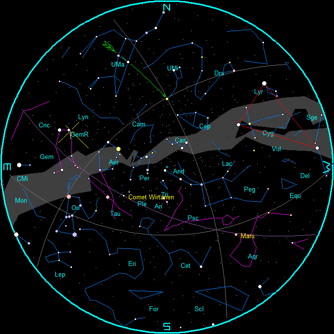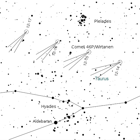 Comet 46P/Wirtanen will be well placed in the evening sky for observation. Though a small comet, it has a history of being active, which is not disappointing us now. It will be closest to the Earth on December16th at 7.1 million miles (11.4 million km).