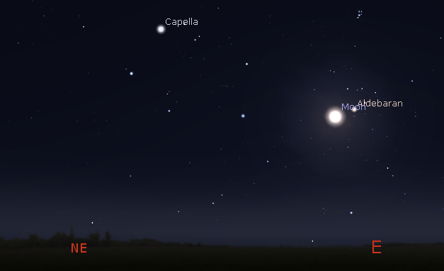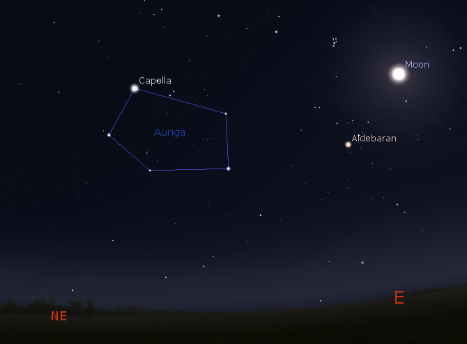 Capella is the northernmost first magnitude stars. Tonight it shines in the northeastern sky. First magnitude stars are the 21 brightest stars in the night sky. Capella is the 6th brightest. The name Capella means little goat, though I’ve always known it as the little she goat. Her three Kids are represented by a narrow triangle of stars positioned to the right of her in tonight’s evening sky, though they may be overpowered by the bright Moon tonight. Capella is in the topmost corner of the pentagonal constellation of Auriga the Charioteer. Capella is actually a system of four stars only 43 light years away. And never sets for listeners in the Interlochen Public Radio transmission area, though all bets are off if you’re listening over the Internet from somewhere else.