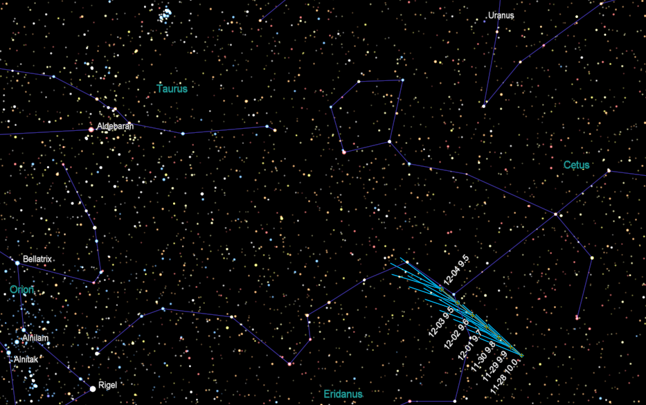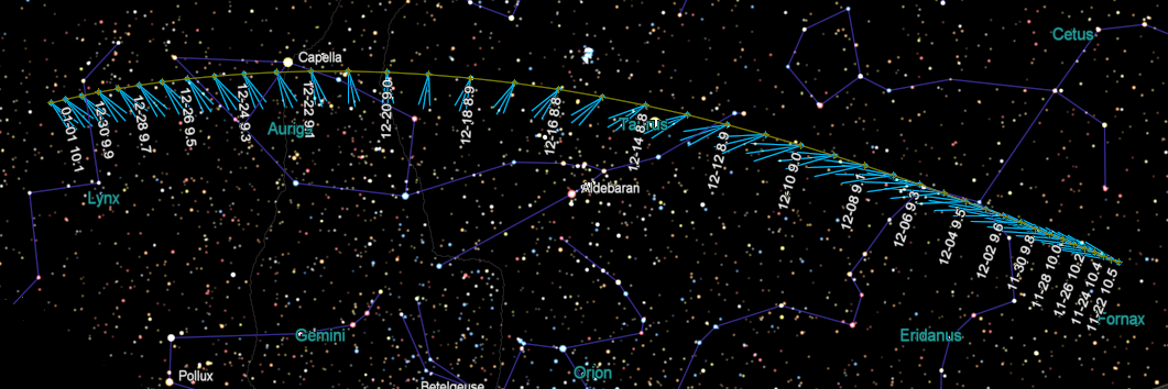 On December 16th the comet will be closest to the Pleiades. On the 23rd it will appear close to the bright star Capella. After that it will become circumpolar.