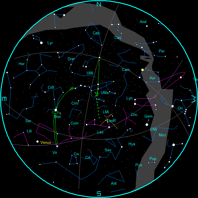 Note the chart times of 9 p.m. and 6 a.m. are for the 15th. For each week before the 15th add ½ hour (28 minutes if you’re picky). For each week after the 15th subtract ½ hour. The planet positions are updated each Wednesday on this blog. For planet positions on dates other than the 15th, check the Wednesday planet posts on this blog.