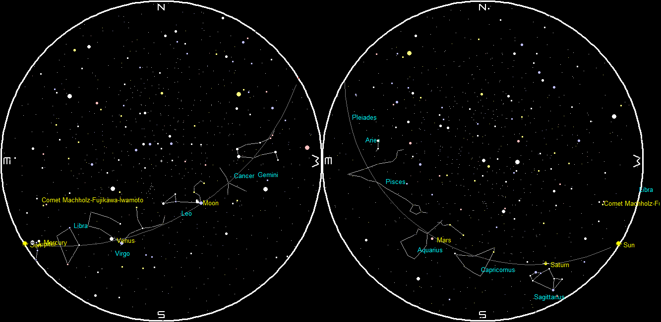 Let’s look at the bright planets for tonight. Two of them are visible in the evening sky. Saturn will be briefly visible very low in the southwestern sky and from about 6 p.m. and will set at 7:10 p.m. Mars will be in the south as the skies darken tonight. Mars will be due south at 6:52 p.m., and it will set at 12:17 a.m. Mars is moving eastward, crossing the constellation of Aquarius this month. It’s currently about midway through Aquarius, moving eastward and northward, so its setting time won’t change much over this month. Venus, our brilliant morning star, will rise at 4:33 a.m. in the east southeast. The blue-white star Spica is still to the right and a bit above it. There are two comets entering our sky. More on that tomorrow.