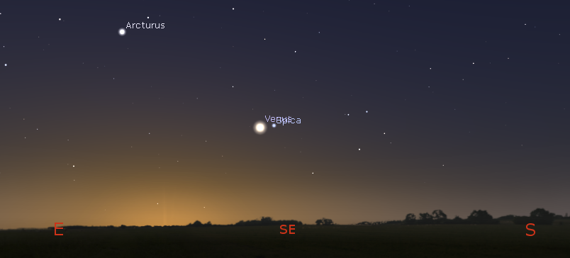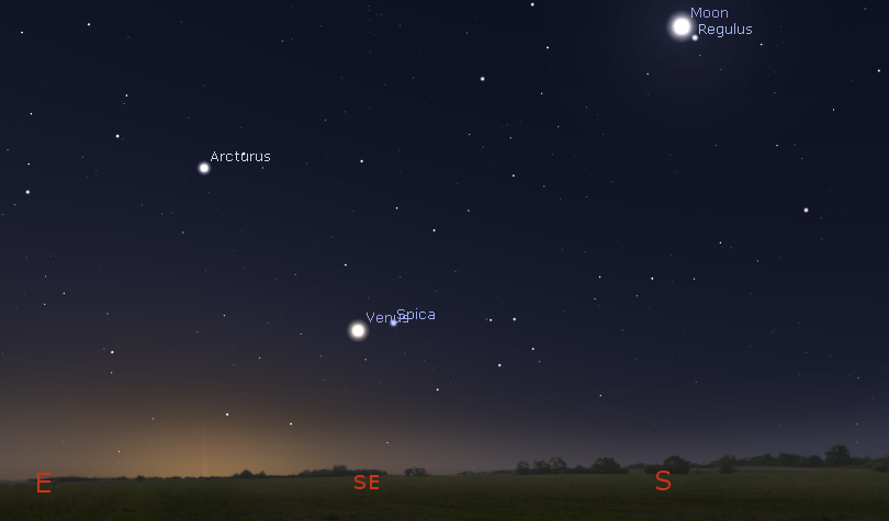 Let’s look at the bright planets for tonight. Two of them are visible in the evening sky. Jupiter is 5 days from passing behind the Sun, and will officially be a morning planet next Monday. Saturn, the ringed planet, will start the evening low in the southwestern sky and will set at 7:35 p.m. Mars will be in the south as the skies darken tonight. Mars will be due south at 7:03 p.m., and it will set at 12:20 a.m. Mars is moving eastward, crossing the constellation of Aquarius this month. It’s currently about midway through Aquarius, moving eastward and northward, so its setting time won’t change much over this month. Venus, our brilliant morning star, will rise at 4:50 a.m. in the east southeast. The blue-white star Spica is to the right and a bit above it.