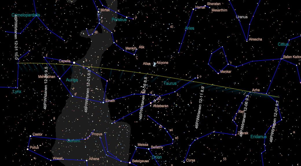 Periodic comet 46P/Wirtanen is moving up from the south and is an evening object. It will pass close to the Pleiades in mid-December and will appear near the bright star Capella around Christmas time.
