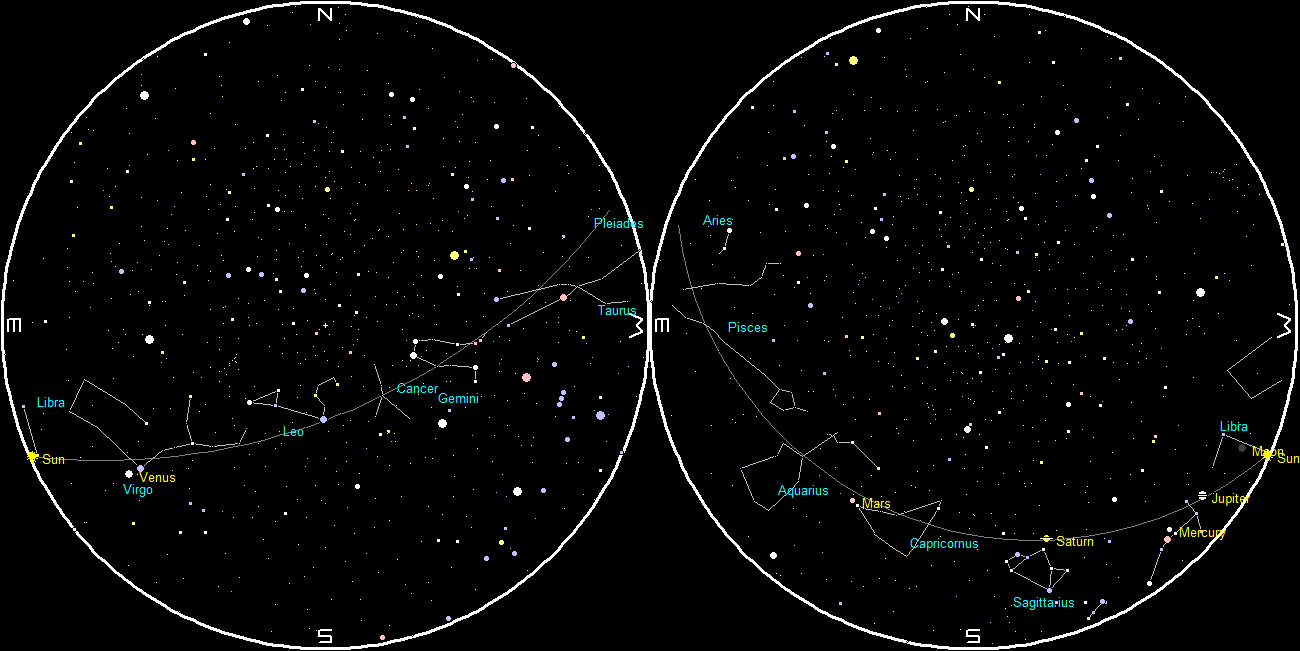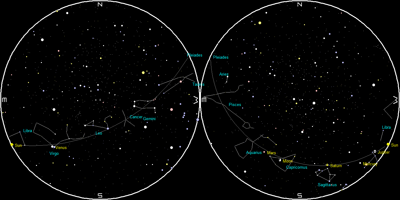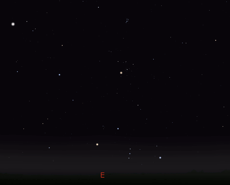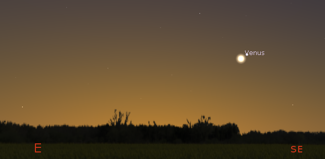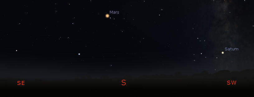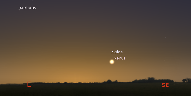 Let’s look at the bright planets for tonight. Two of them are visible in the evening sky. Jupiter will set too soon after sunset to be seen. It will set only 29 minutes after the Sun. Saturn, the ringed planet, will start the evening low in the southwestern sky and will set at 7:59 p.m. Mars will be low in the south as the skies darken tonight. Mars will be due south at 7:15 p.m., and it will set at 12:24 a.m. Mars is moving eastward, crossing the constellation of Aquarius this month. It’s currently at the western edge of Aquarius, moving eastward and northward, so its setting time won’t change much over this month. Venus, our brilliant morning star, will rise at 5:15 a.m. in the east southeast. The blue-white star Spica is just above and right of it now.
