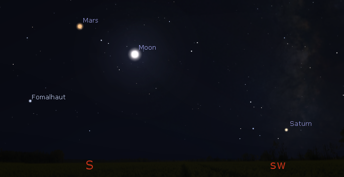 Let’s look at the bright planets for tonight. Two of them are visible in the evening sky. Jupiter will set too soon after sunset to be seen. It will set only 44 minutes after the Sun. Saturn, the ringed planet, will start the evening low in the southwestern sky and will set at 8:24 p.m. Mars will be low in the south as the skies darken tonight. and is now 77.8 million miles (125.2 million km) away. Mars will be due south at 7:26 p.m., and it will set at 12:28 a.m. Mars is moving eastward, crossing the constellation of Aquarius this month. It’s currently at the western edge of Aquarius. Venus, now the brilliant morning star, will rise at 5:57 in the east southeast. It will grace our morning skies through next spring.