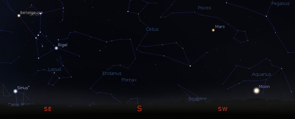 Mars and the Moon with the evening constellations tonight at 8 p.m. January 9, 2019. Click on the image to enlarge. Created using Stellarium.