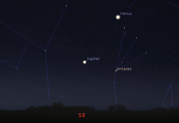 Venus and Jupiter in the morning at 7 a.m. tomorrow morning January 10, 2019. Created using Stellarium.
