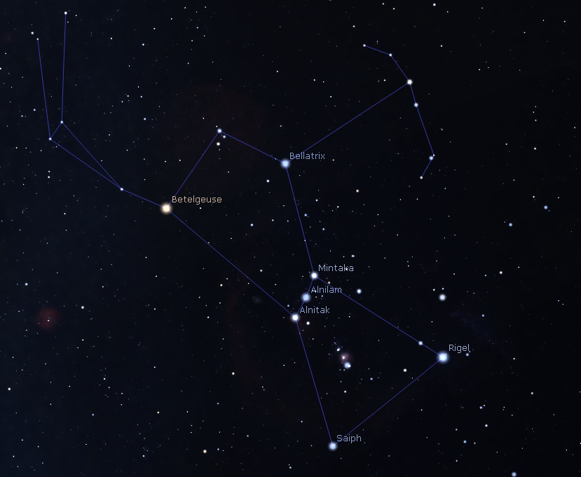 Orion’s brightest stars with their names for 9 p.m. January 7, 2019. Click on the image to make Orion a giant hunter. Created using Stellarium..