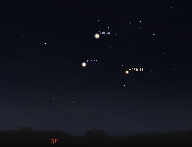 Venus and Jupiter with the same magnification at 6 a.m. tomorrow morning January 17, 2019. Created using Cartes du Ciel (Sky Charts).