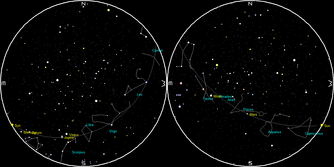 Planets and the Moon at sunset and sunrise of a single night starting with sunset on the right on January 16, 2019. The night ends on the left with sunrise on the 17th. Click on the image to enlarge. Created using my LookingUp program.