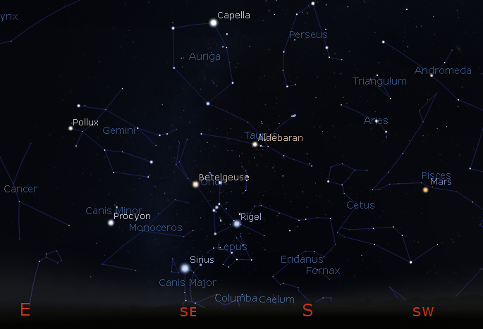 Mars with the evening stars and constellations tonight at 8 p.m. January 23, 2019. Click on the image to enlarge. Created using Stellarium.