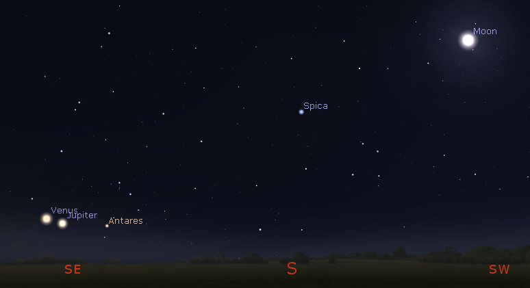 Venus and Jupiter with the same magnification at 6 a.m. tomorrow morning January 24, 2019. Created using Cartes du Ciel (Sky Charts).