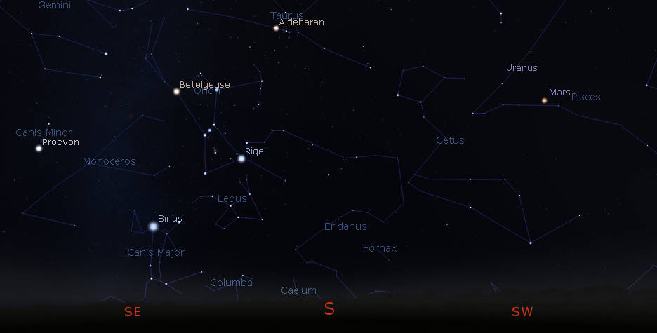 Mars and the evening constellations tonight at 8 p.m. January 30, 2019. Click on the image to enlarge. Created using Stellarium.