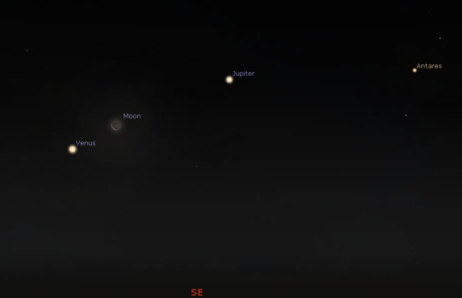 Venus, the Moon and Jupiter in the morning at 6 a.m. tomorrow morning January 31, 2019. Saturn will rise at 6:37 tomorrow morning into twilight. It will make our morning planet view next week. Click on the image to enlarge. Created using Stellarium.