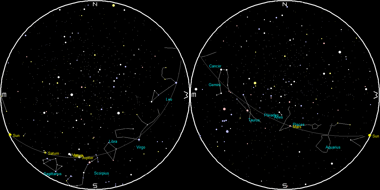 Planets and the Moon at sunset and sunrise of a single night starting with sunset on the right on January 30, 2019. The night ends on the left with sunrise on the 31st. Mercury does not show on these charts because it is south of the Sun, having passed superior conjunction on the 29th. Click on the image to enlarge. Created using my LookingUp program.