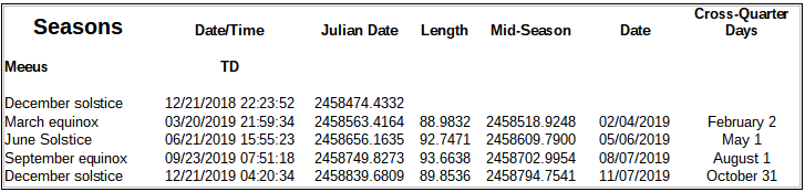 The equinoxes and solstices are quarter days, for the four seasonal quarters of the year. The table above has Mid-Season and Date for the half way point in the season. The Cross-Quarter Days column are the dates which are more or less celebrated down throughout history.