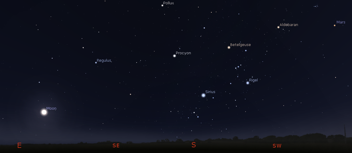 Mars and the Moon and the bright stars on the first day of spring at 9 p.m. March 20, 2019. Click on the image to enlarge. Created using Stellarium.