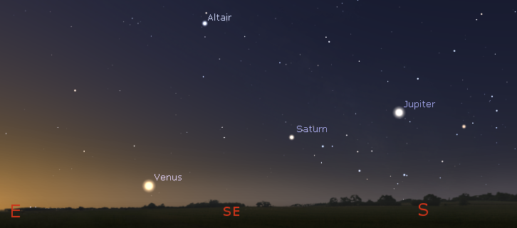 Let’s look at the planets for this week. Mars will be in the western sky this evening, below the Pleiades, or Seven Sisters, star cluster. It will pass to the left of the Pleiades Saturday night. Tonight, however, it will set at 12:34 a.m. In the morning sky we have Jupiter which will rise tomorrow at 2:29 a.m. in the east-southeast. It is second to Venus in brightness. Saturn will be next to rise at 4:14 a.m., also in the east-southeast. Venus will rise at 6:20 a.m. also in the east-southeast. By 7 in the morning they will be strung out from the southeast to the south, with the last quarter Moon between Jupiter and Saturn. The Moon will pass Saturn early Friday morning before it rises and will be seen then to the left of Saturn.