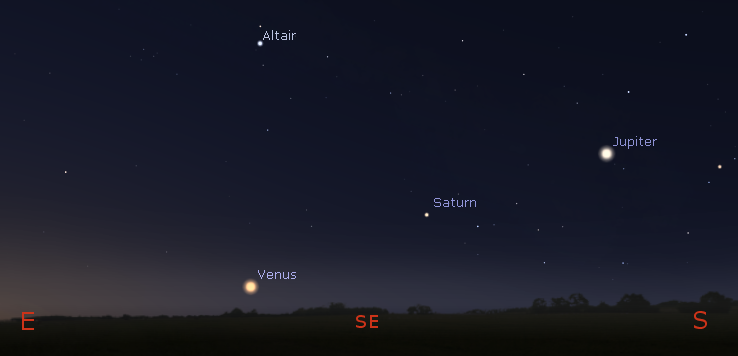 Jupiter, Saturn and Venus with the same magnification at 7 a.m. tomorrow morning March 14, 2019. Created using Cartes du Ciel (Sky Charts).