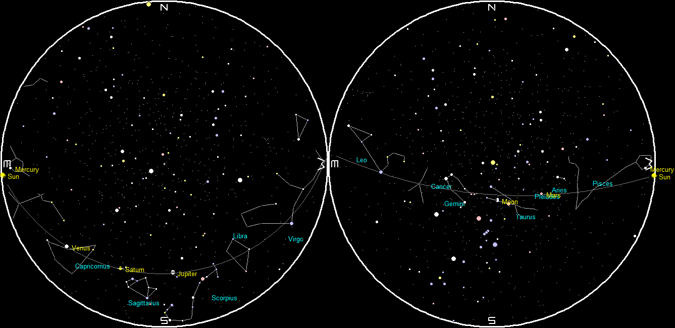 Planets and the Moon at sunset and sunrise of a single night starting with sunset on the right on March 13, 2019. The night ends on the left with sunrise on the 14th. Click on the image to enlarge. Created using my LookingUp program.