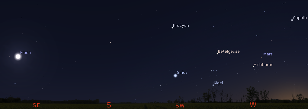 Mars and the Moon tonight at 9:30 p.m. April 17, 2019. Click on the image to enlarge. Created using Stellarium.