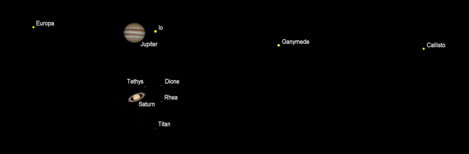 Jupiter and Saturn with the same magnification at 6:30 a.m. tomorrow morning April 18, 2019. Click on the image to enlarge. Created using Cartes du Ciel (Sky Charts).