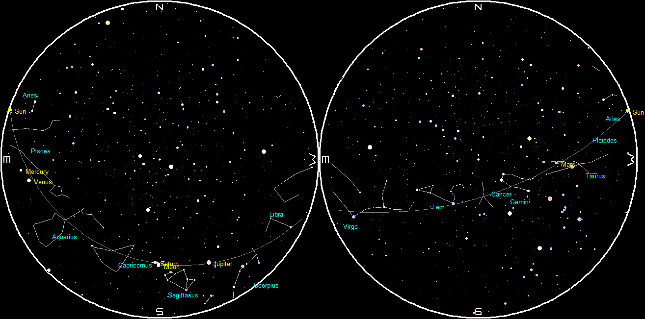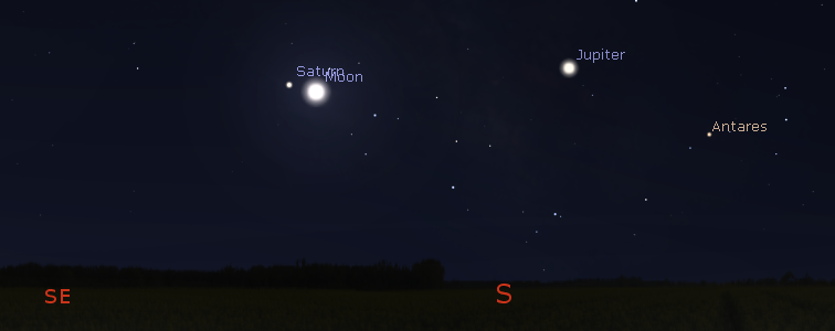 Let’s look at the planets for this week. Mars will be in the western sky this evening, above the V-shaped stars of the face of Taurus the bull. It will set at 12:18 a.m. In the morning sky we have Jupiter, in Ophiuchus, which will rise tomorrow at 12:39 a.m. in the east-southeast. Saturn will be next to rise at 2:27 a.m., also in the east-southeast. It is in Sagittarius. Tomorrow morning the Moon will be just right of the ringed planet. Venus will rise at 5:47 a.m. in the east. Venus will remain in our morning sky, though too close to the rising Sun to be easily glimpsed until August when it passes behind the Sun to enter the evening sky. It will be in position later this year to be our bright evening Christmas Star.