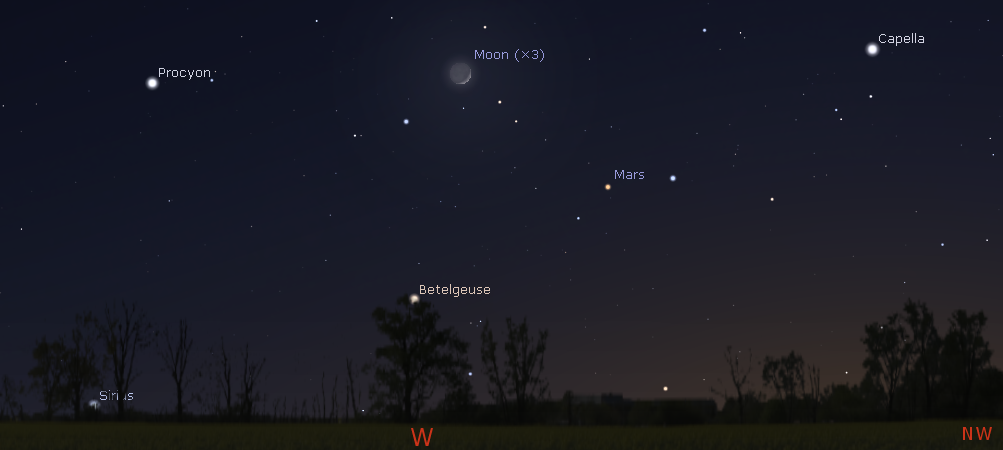 Mars and the Moon (at 3 times its actual size) tonight at 10 p.m. May 8, 2019. Click on the image to enlarge. Created using Stellarium.