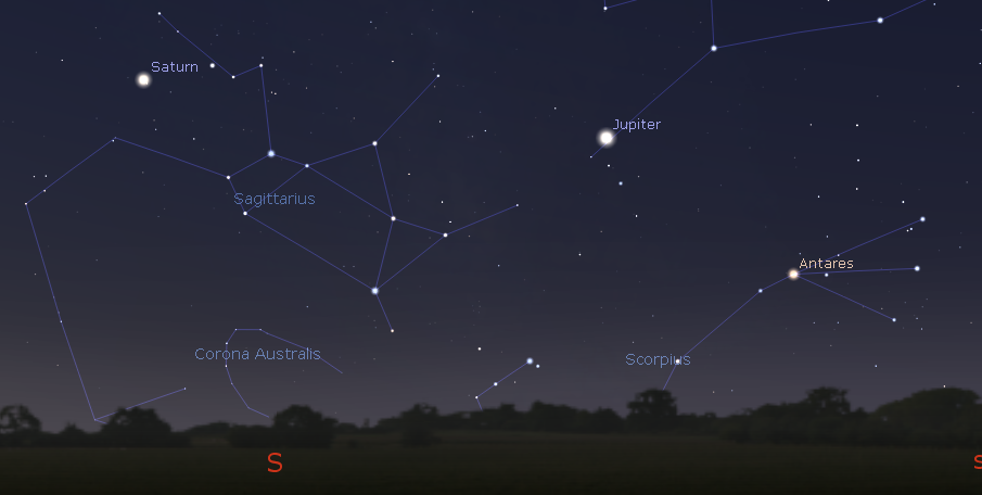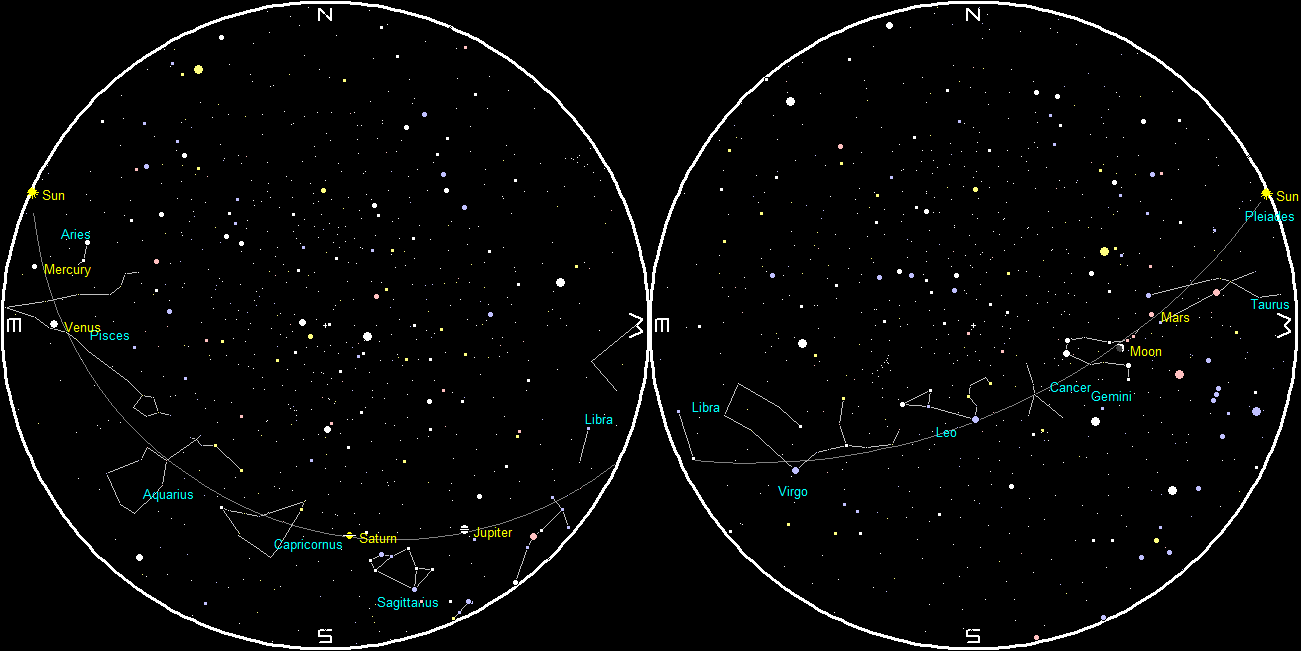 Let’s look at the planets for this week. Mars will be in the western sky this evening, between Gemini and Taurus the bull. It will set at 12:07 a.m. In the morning sky we have Jupiter, in Ophiuchus, which will actually rise at 11:40 tonight in the east-southeast. Saturn will be next to rise at 1:32 a.m., also in the east-southeast. It’s in Sagittarius. Both planets are easily visible in the morning twilight. Venus will rise 53 minutes before the Sun in the east. It will remain in our morning sky, though too close to the rising Sun to be easily glimpsed. In August it will pass behind the Sun to enter the evening sky. It will be in position later this year to be our bright evening Christmas Star.