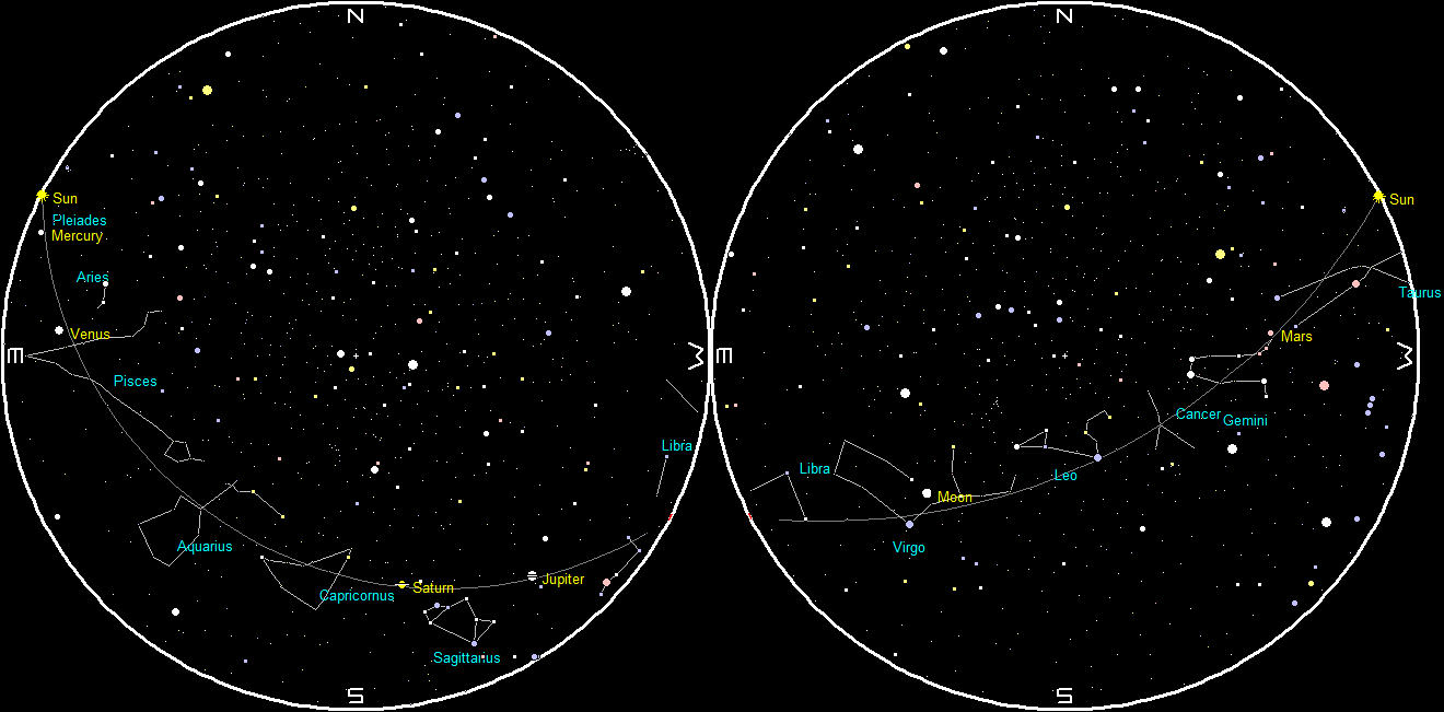 Let’s look at the planets for this week. Mars will be in the western sky this evening, entering Gemini near Castor’s foot. It will set at 12:04 a.m. In the morning sky we have Jupiter, in Ophiuchus, which will actually rise at 11:09 tonight in the east-southeast. Jupiter won’t be considered an evening planet until it rises before sunset, which will occur after June 10th. Saturn will be next to rise at 1:04 a.m., also in the east-southeast. It’s in Sagittarius. Both planets are easily visible in as morning twilight grows. Venus will rise 53 minutes before the Sun in the east. It will remain in our morning sky, though too close to the rising Sun to be easily glimpsed. In August it will pass behind the Sun to enter the evening sky.