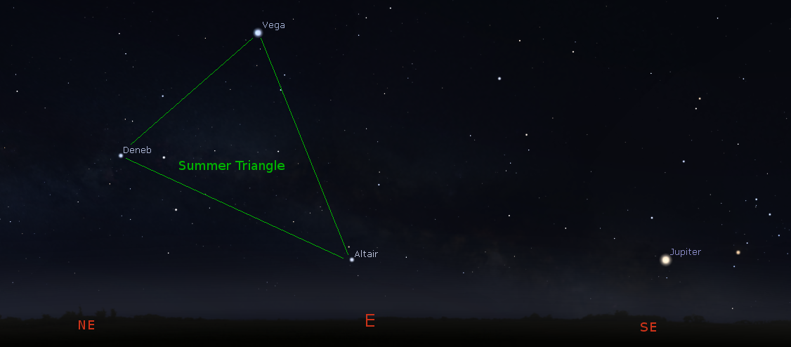 Even though Summer is 17 days away the three bright stars of the Summer Triangle are visible in the eastern sky at 11 p.m. The three stars are Vega highest in the east. Deneb is lower in the northeast. Altair is lower close to the horizon in east. They will rise higher throughout the summer season. Looking close to the horizon in the southeast that bright star at that hour is the planet Jupiter.