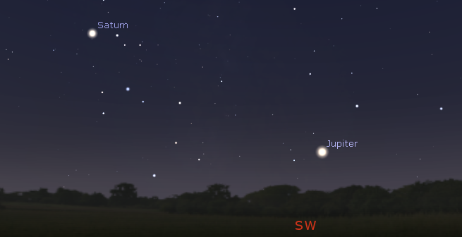 Jupiter and Saturn at 4:30 a.m. June 13, 2019. Click on the image to enlarge. Created using Stellarium.