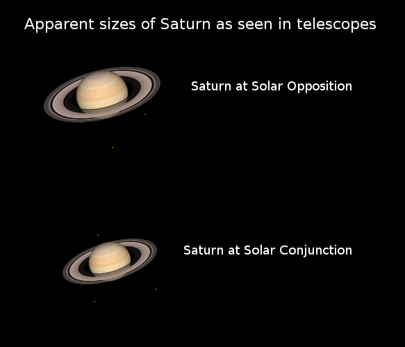 Today Saturn will pass in opposition from the Sun at 12:12 p.m. It’s a time when Saturn will rise as the Sun sets, being opposite the Sun in the sky, and a time near its closest to the Earth at 841 million miles (1.354 billion km). Saturn orbits the Sun at a distance of 10 times the Earth’s distance, so Saturn’s distance from the Earth varies from 9 times to 11 times the Earth’s distance from the Sun. So it doesn’t change much in size in telescopes. This is unlike Mars which has a greater range of distances from the Earth. In telescopes the rings are the first one sees, with the planet nestled in the center. In small telescopes, it is a tiny but magnificent sight. It’s largest moon Titan is visible nearby.