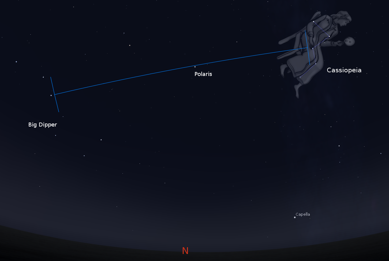 Cepheus is a dim church steeple of a constellation. Its dim star Delta is a variable star, the prototype of an important class of distance measuring stars called Cephieds in its honor. Cassiopeia is the famous W shaped constellation that along with Cepheus doesn’t set at our latitude.
