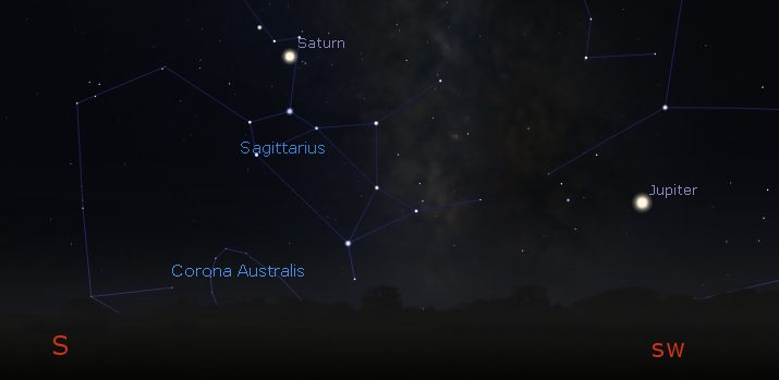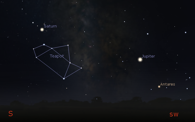 Jupiter and Saturn with the Teapot asterism of Sagittarius of the southern sky at 9 p.m. September 25, 2019. Created using Stellarium.