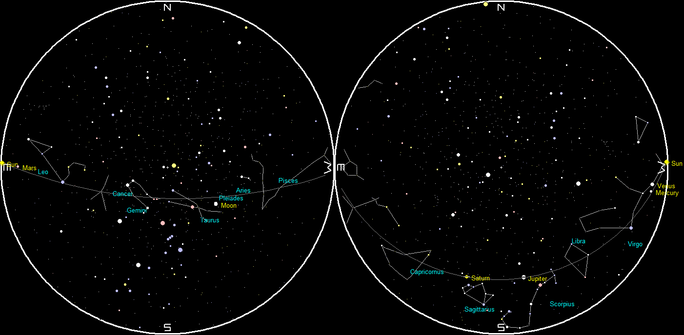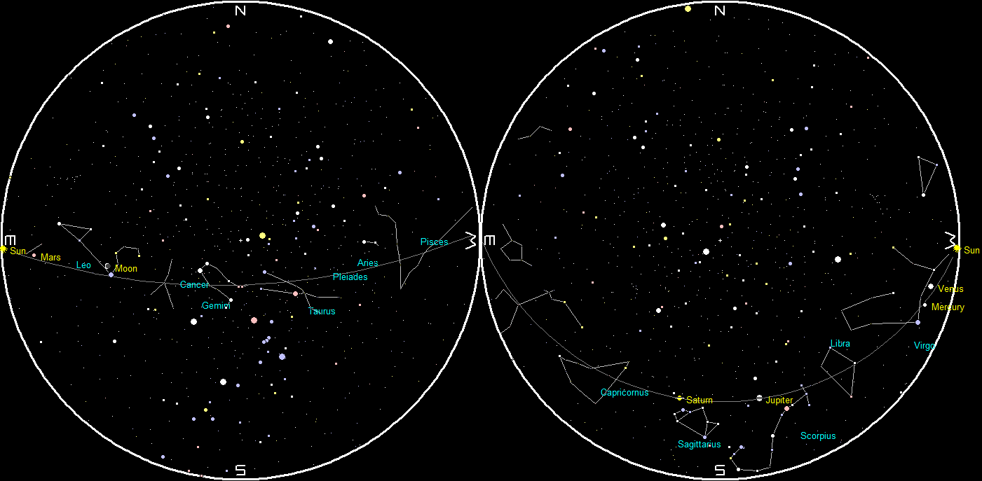 The great star wheel of the sky rolls on. In the evening sky gone are the stars of spring, and going are the southern stars of summer. In the morning sky before sunrise the stars of an early winter evening.