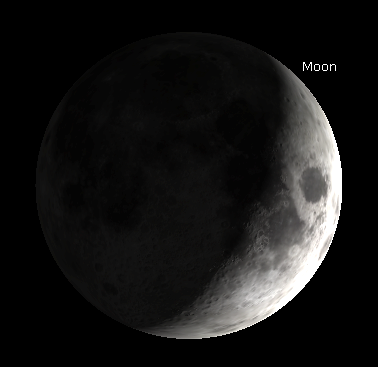 The crescent Moon as it might appear in binoculars or a small telescope tonight at 10 p.m. September 4, 2019. Created using Stellarium.