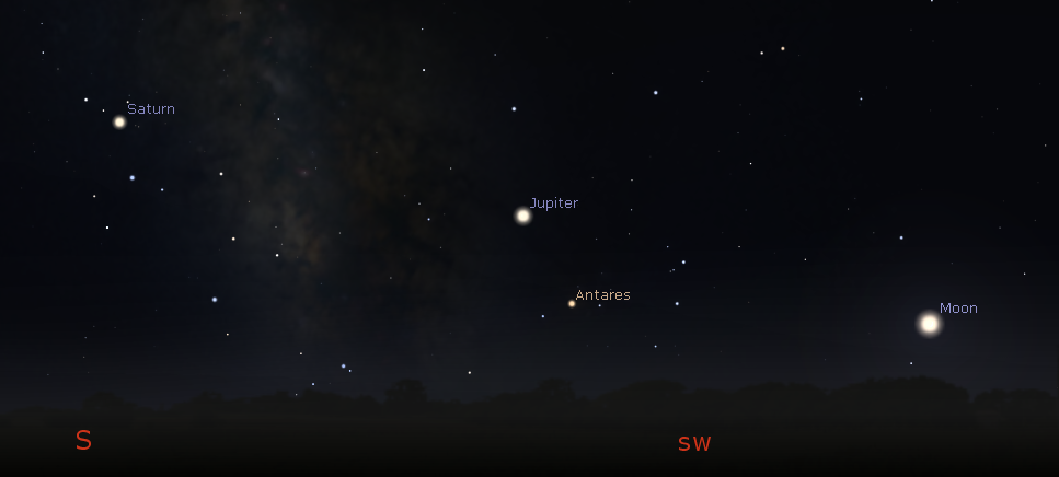 Jupiter, Saturn and the Moon with the bright stars of the southern summer sky at 10 p.m. September 4, 2019. Click on the image to enlarge. Created using Stellarium.