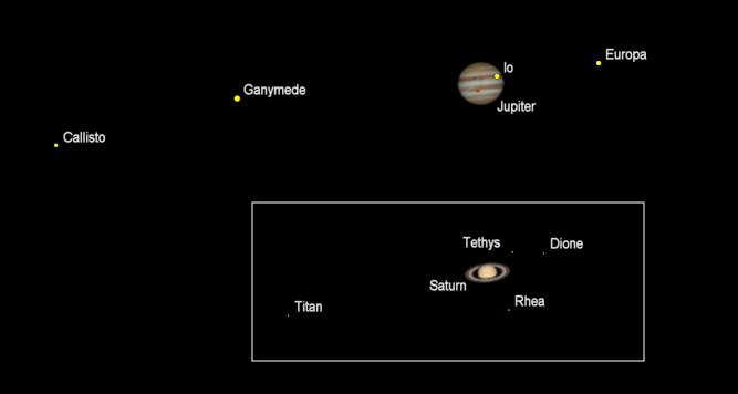 Let’s look at the planets for this week. Mars, Venus and Mercury are too close to the Sun to be seen. Venus and Mercury are on the evening or east side of the Sun, Mars is on the west or morning side. Bright Jupiter will be in the south-southwestern sky as it gets dark. With steadily held binoculars a few of the 4 largest satellites of Jupiter can be seen. Three of the four of Jupiter’s Galilean satellites can be spotted in telescopes early this evening tonight. However the innermost moon Io will move from in front of the planet at 10:15 p.m. Jupiter will set at 12:11 a.m. Saturn, the ringed planet, will be in the southern sky in the evening. It will pass the meridian, due south at 9:48 p.m. and will set at 2:14 a.m.