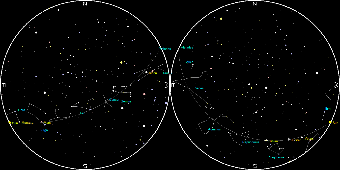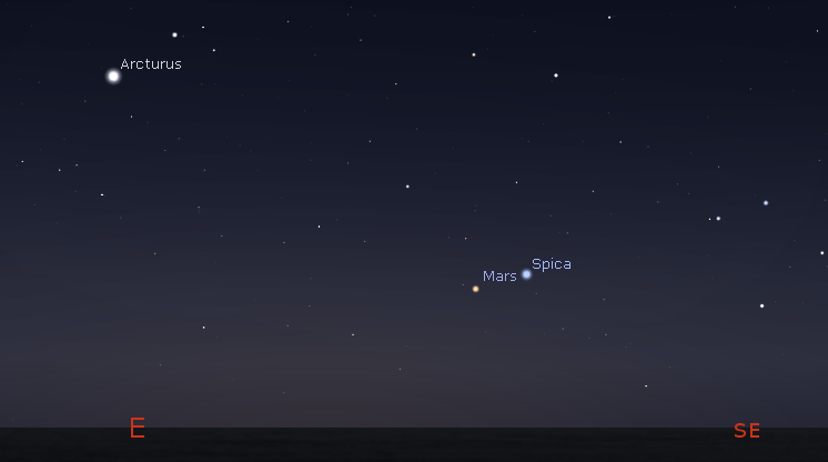 Let’s look at the bright planets for this week. Venus is starting to make an evening appearance. It will be briefly visible low in the west-southwest before it sets at 6:28 p.m. Jupiter will be very low in the southwestern sky as it gets dark. It will set at 7:17 p.m. Jupiter is moving at nearly its fastest to the east now and next year will be where Saturn is currently. Saturn, the ringed planet, will be in the south-southwestern sky in the evening, and will set at 9:15 p.m. Next year it will be a bit farther east. Jupiter is approaching Saturn in our sky. Mars is in the morning sky and will rise in the east-southeast at 5:25 a.m. It’s not very bright because it’s 230 million (370 million km) miles away, but it’s getting slowly closer to the Earth.