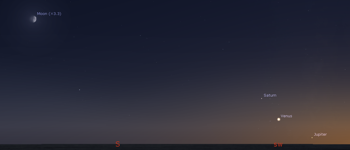 Jupiter, Venus and Saturn against a flat horizon tonight at 6 p.m. December 4, 2019. Click on the image to enlarge. Created using Stellarium.