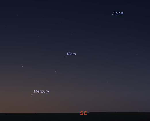 Mars and Mercury in the morning with the star Spica at 7 a.m. December 4, 2019. Created using Stellarium.