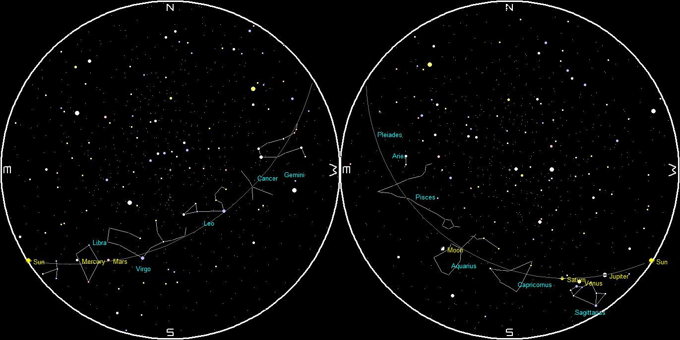 Planets and the Moon at sunset and sunrise of a single night starting with sunset on the right on December 4, 2019. The night ends on the left with sunrise on the 5th. Click on the image to enlarge. Created using my LookingUp program.
