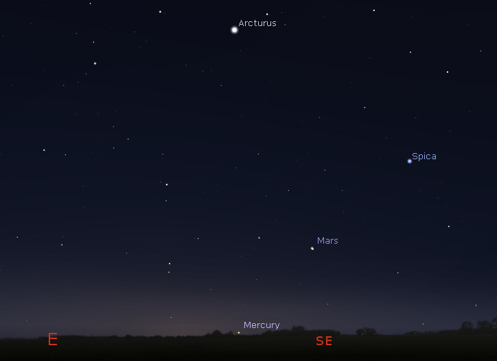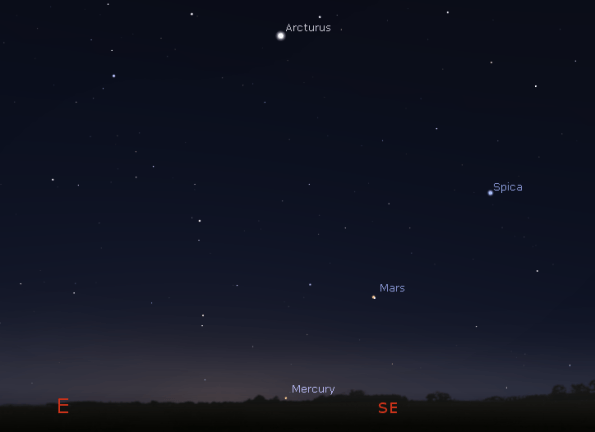 Let’s look at the naked-eye planets for this week. Venus will be briefly visible low in the southwest before it sets at 7:06 p.m. Jupiter is lost in twilight. It will pass behind the Sun on the 27th and will enter the morning sky. Saturn, the ringed planet, will be in the southwestern sky in the evening, and will set at 7:13 p.m. Tonight Saturn will be about 2 degrees or 4 moon widths to the upper right of the much brighter Venus. Mars is in the morning sky and will rise in the east-southeast at 5:13 a.m. It’s not very bright because it’s 215 million (346 million km) miles away, but it’s getting slowly closer to the Earth. Mercury is now too close to the Sun to be seen in morning twilight.