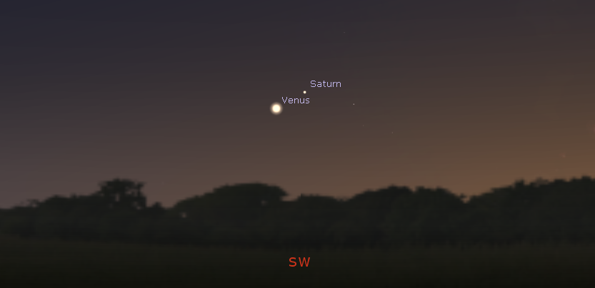 Venus and Saturn low ion the southwest tonight at 6 p.m. December11, 2019. Click on the image to enlarge. Created using Stellarium.