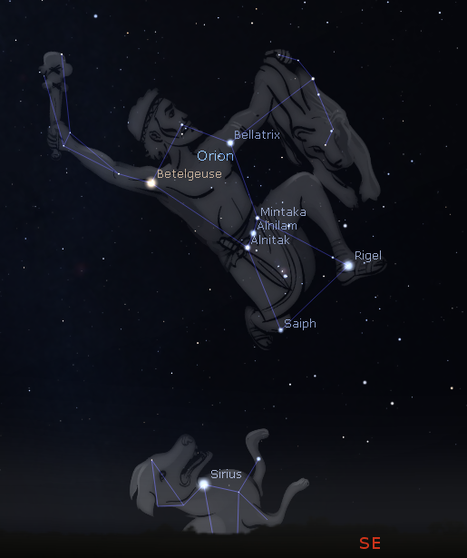 The named bright stars of Orion and Canis Major, the dog rising below Orion with Sirius. Beside the stars mentioned in the program are the stars of Orion’s belt that have their own program later on in winter. Created using Stellarium.