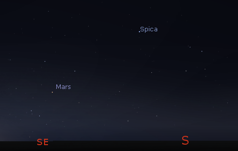 Mars is in the morning sky and will rise in the east-southeast at 5:07 a.m. It’s not very bright because it’s 206 million (332 million km) miles away, but it’s getting slowly closer to the Earth. Mercury is now too close to the Sun to be seen in the morning.