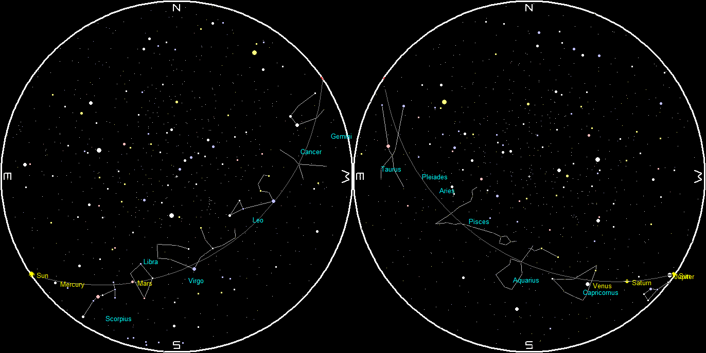 Planets and the Moon at sunset and sunrise of a single night starting with sunset on the right on December 25, 2019. The night ends on the left with sunrise on the 26th. The Moon at the morning hour is south of the Sun having just completing a solar eclipse for Asia. Click on the image to enlarge. Created using my LookingUp program.